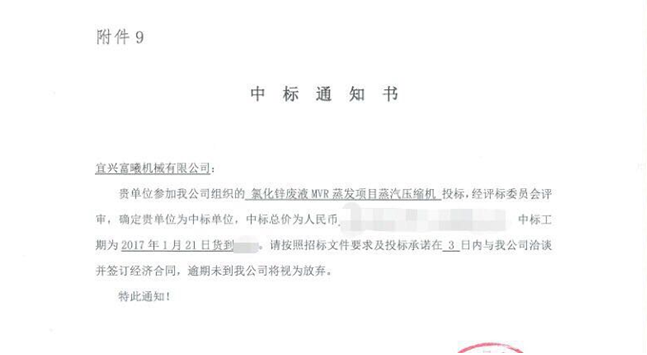 富曦生产制造的MVR罗茨蒸汽压缩机中标中铝国际工程股份有限公司项目